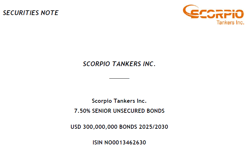 Reports & Presentations Category Category Other Financial Events Conferences Construction Updates Financial Results Miscellaneous ESG Reports Year Year 2026 2025 2024 2023 2022 2021 2020 2019 2018 2017 2016 2015 Search Submit $300M 2030 Senior Unsecured Bonds - ISIN NO0013462630 Jun 06, 2025 Scorpio Tankers Inc. 2024 Sustainability Report May 16, 2025 Scorpio Tankers Inc. Q1 2025 Earnings Presentation May 01, 2025 Scorpio Tankers Inc. 2024 Annual Report (Form 20-F) Mar 21, 2025 Scorpio Tankers Inc. Q4 2024 Earnings Presentation Feb 13, 2025 Scorpio Tankers Inc. Capital Link Jan. 2025 Presentation Jan 07, 2025